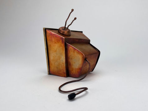 This piece was designed and built as a functioning prop for a stop motion set. It was fabricated out of copper, brass, plastic, clay, and an LED light. The screws on the front plate are fully functional, allowing the frame to be removed so that the light and plastic screen inside can be adjusted.